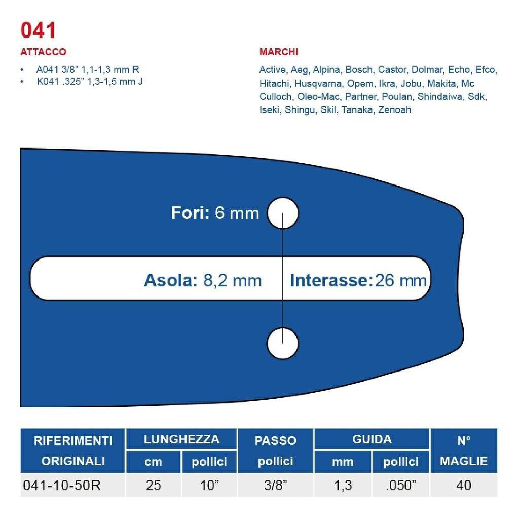 La barra per motosega '041' maya è un tipo specifico di barra progettata per l'applicazione di catene da taglio. Le specifiche di attacco della barra includono un'asola con un diametro di 8,2 mm, un interasse di 26 mm e fori con un diametro di 6 mm.