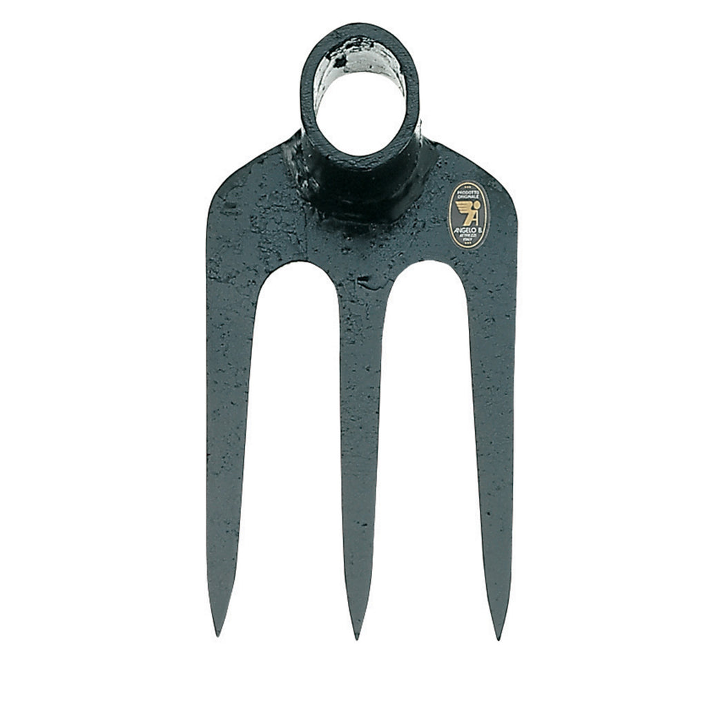 La zappa tridente è uno strumento agricolo utilizzato per lavorare il terreno, simile alla zappa con bidente. È composta da una testa con tre punte o denti affilati e da un manico solitamente in legno.