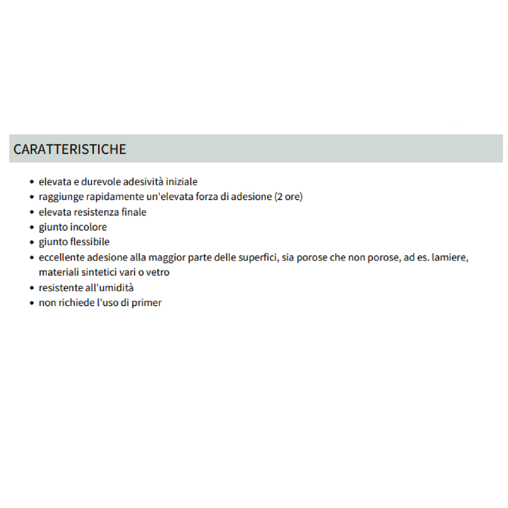 • Versatilità: Perfetto per materiali porosi e lisci, è ideale per incollaggi invisibili di elementi architettonici, materiali edili, arredi, vetrine e serramenti.