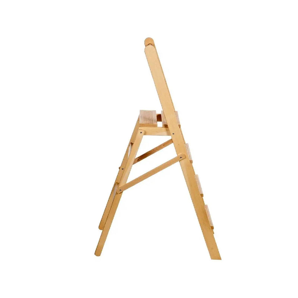 Sgabello "Scaletta" con barra di appoggio realizzato in legno grezzo resistente e pieghevole