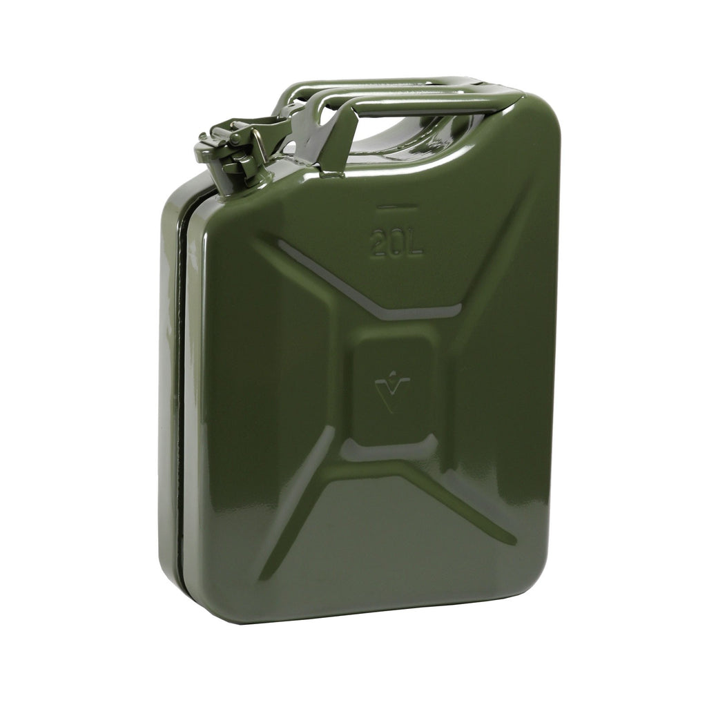 Tanica in metallo verniciata a polvere per il trasporto sicuro di idrocarburi, progettata per resistere agli ambienti più impegnativi.