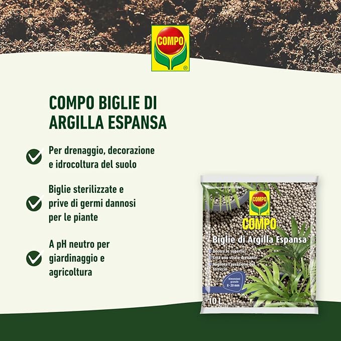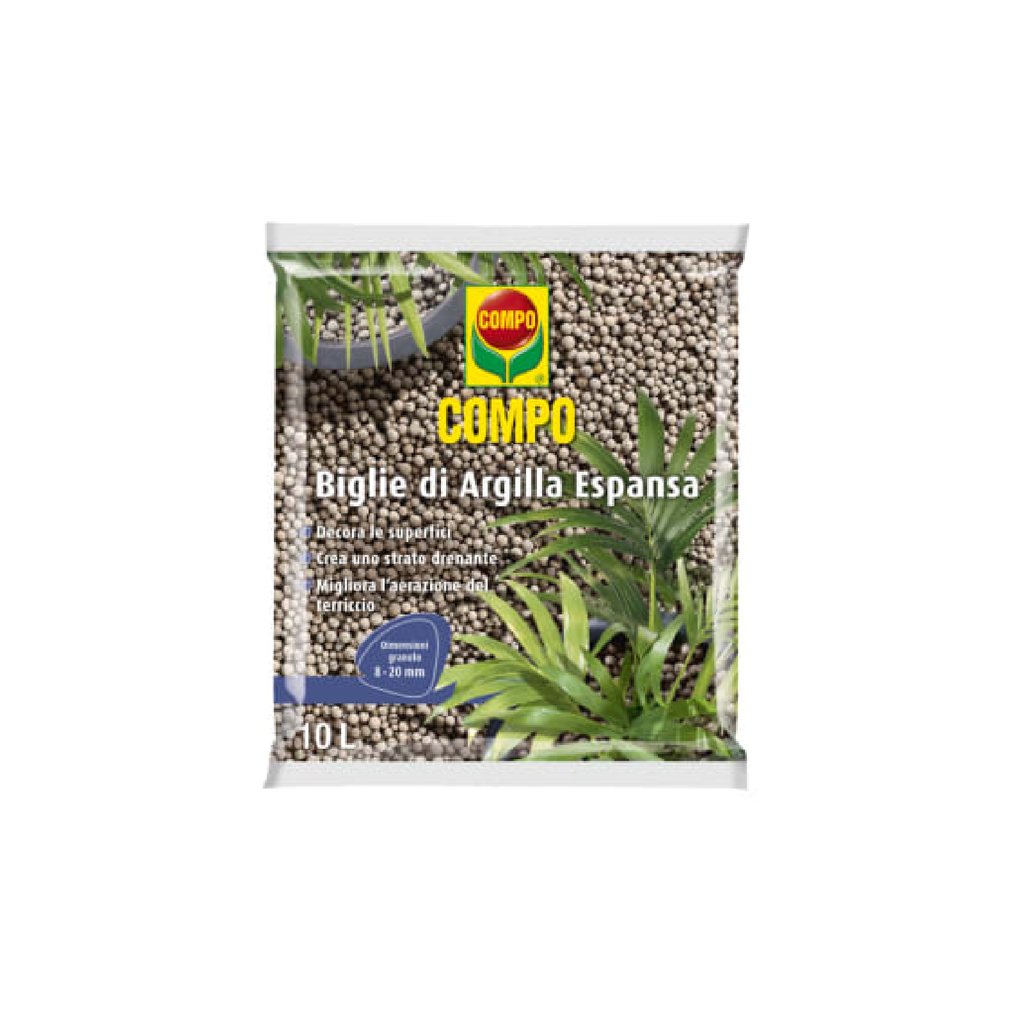 Porre uno strato di 2-3 cm di Biglie di Argilla Espansa COMPO sul fondo del contenitore. Riempire poi il vaso con del terriccio adatto al