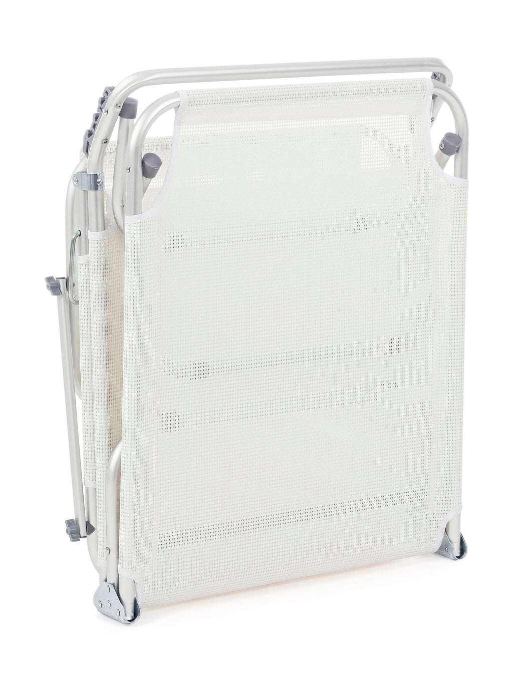 Poggiatesta reclinabile a 3 posizioni, fino ad un ripiegamento totale del lettino assumendo la forma di un vero e proprio letto singolo.