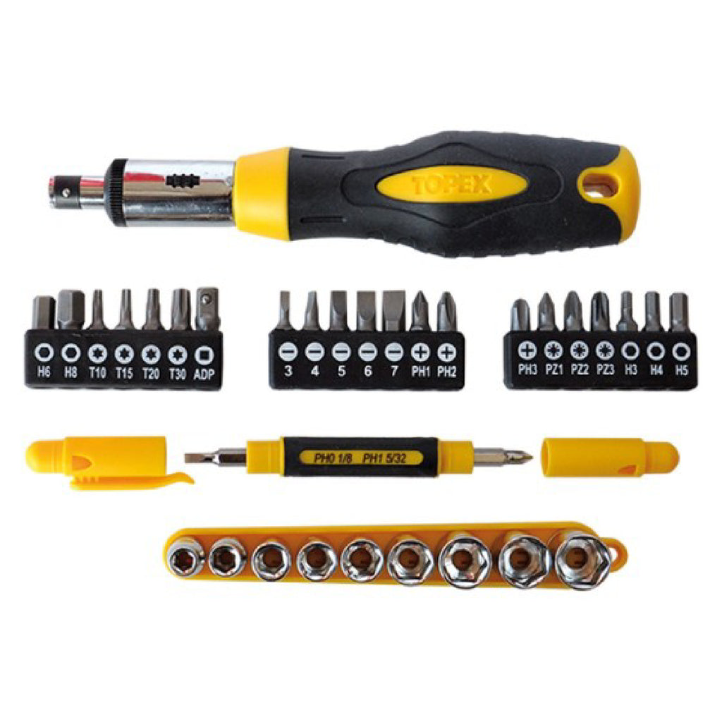 Cacciavite "TOPEX" a cricchetto reversibile in cromo-vanadio con set di 30 inserti