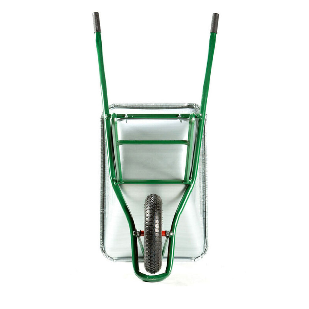 La vasca della carriola è zincata, che offre una protezione efficace contro la corrosione e la ruggine, rendendola adatta per un uso duraturo anche in condizioni ambientali avverse.