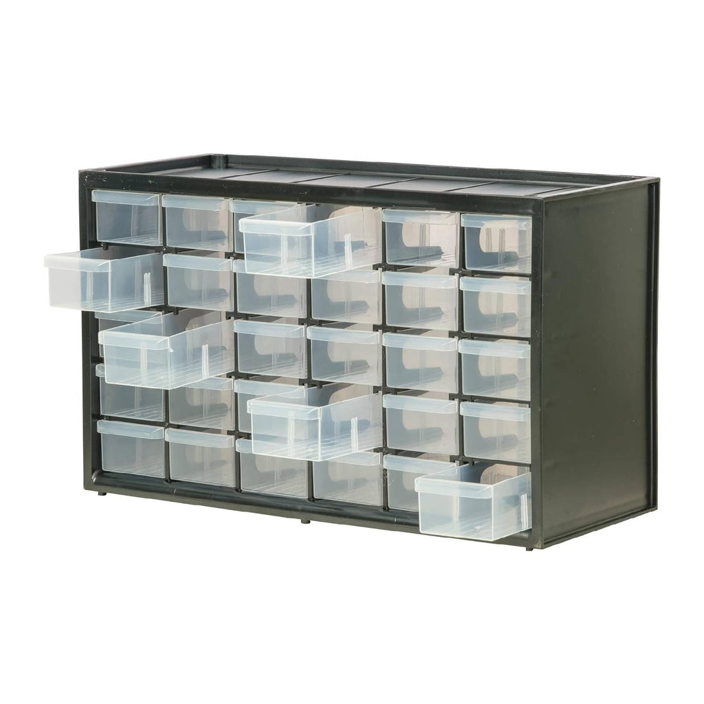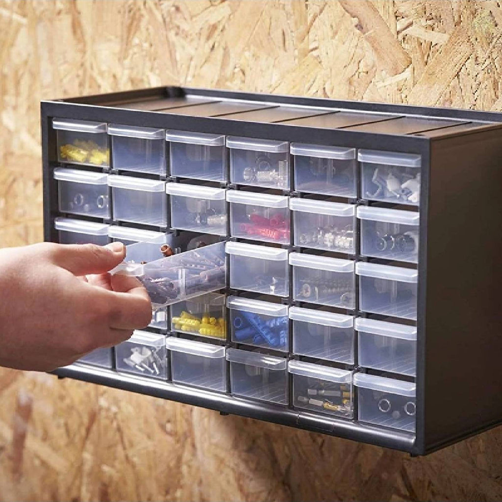 • 30 Cassetti Trasparenti: La cassettiera è dotata di 30 cassetti trasparenti che consentono di visualizzare facilmente il contenuto senza dover aprire ogni cassetto.