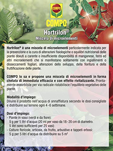 Hortrilon® è una miscela di microelementi particolarmente indicata per la prevenzione e la cura di alterazioni fisiologiche o squilibri nutrizionali delle piante dovuti a carente o insufficiente disponibilità di manganese, ferro ed altri microelementi che si manifestano solitamente con ingiallimenti o disseccamenti fogliari, alterazioni dello sviluppo, della fioritura e della fruttificazione delle piante.