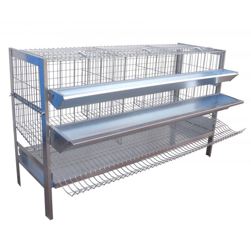 Gabbia galline ovaiole, 3 fori, 9 posti galline, scivoli in acciaio inox, due sostegni a parete, mangiatoie a canaletta in lamiera zincata, portello di chiusura foro, abbeveratoio, vaschette raccogli goccia.