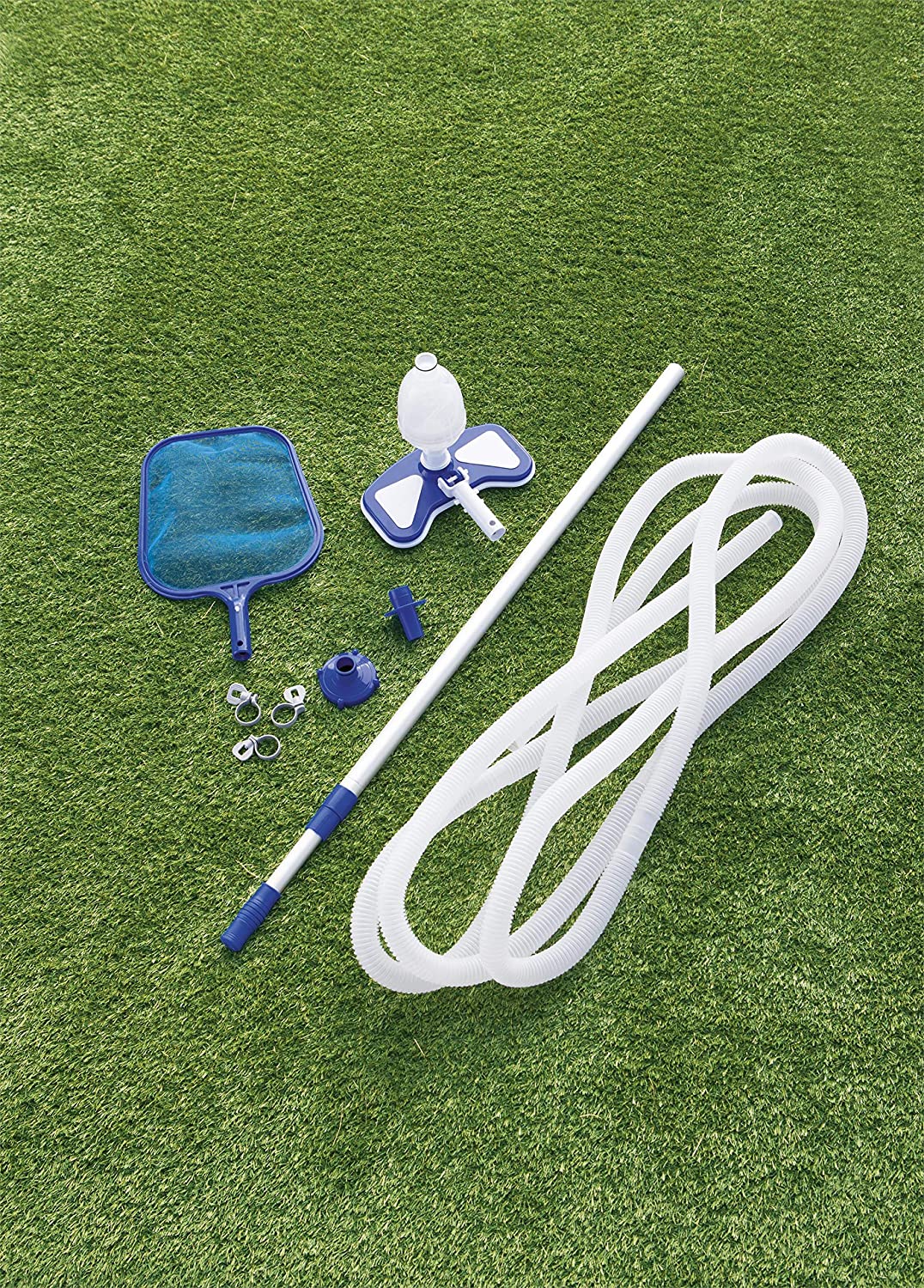 In un’unica confezione si dispone di tutto il necessario per una manutenzione efficace e precisa della vostra piscina all'aperto: un’asta telescopica da 2,79 metri, un retino per la pulizia della superficie dell’acqua e un sistema di aspirazione da collegare alla pompa di filtraggio della piscina stessa.