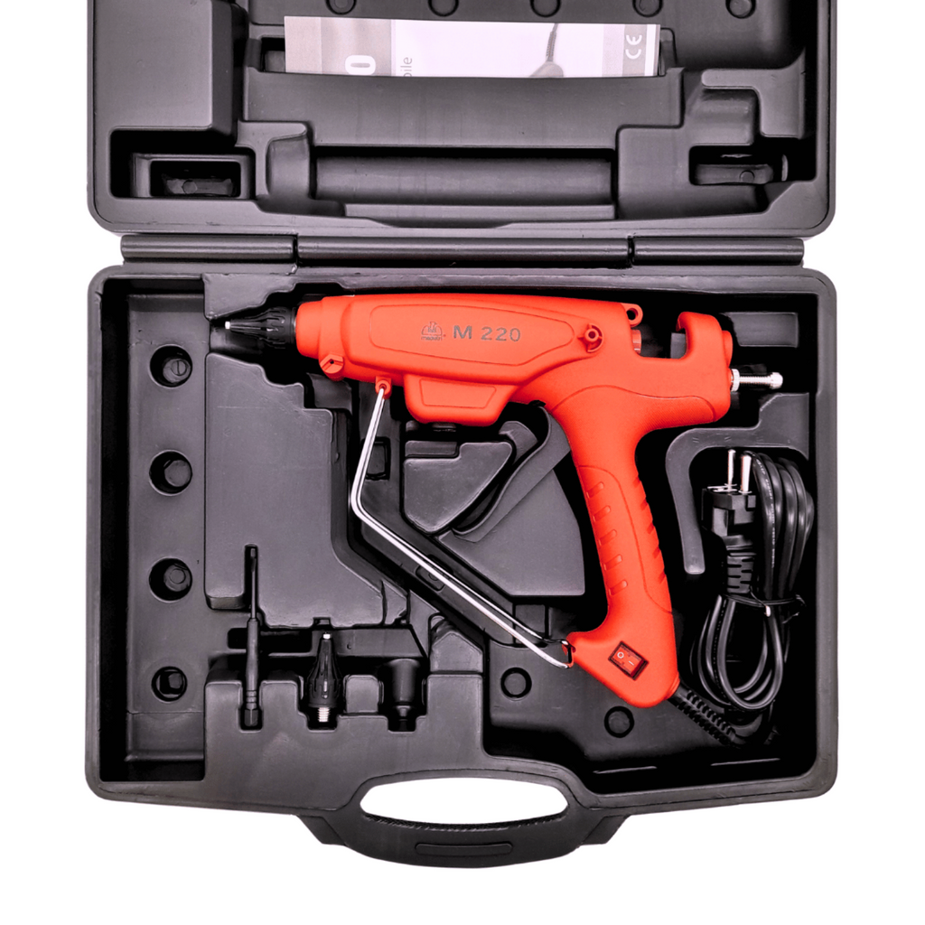 La pistola termocollante "M220" è uno strumento professionale progettato per applicazioni che richiedono prestazioni elevate, ideale per progetti di incollaggio intensivi e di precisione.