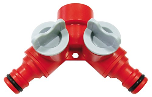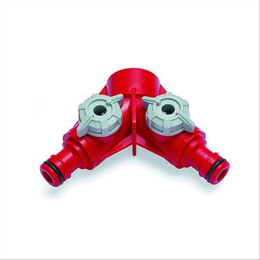 Presa da rubinetto con doppia uscita, dotata di regolazione del flusso differenziata. Vi sono 2 vie con valvole a sfera ed innesti (M) maschio