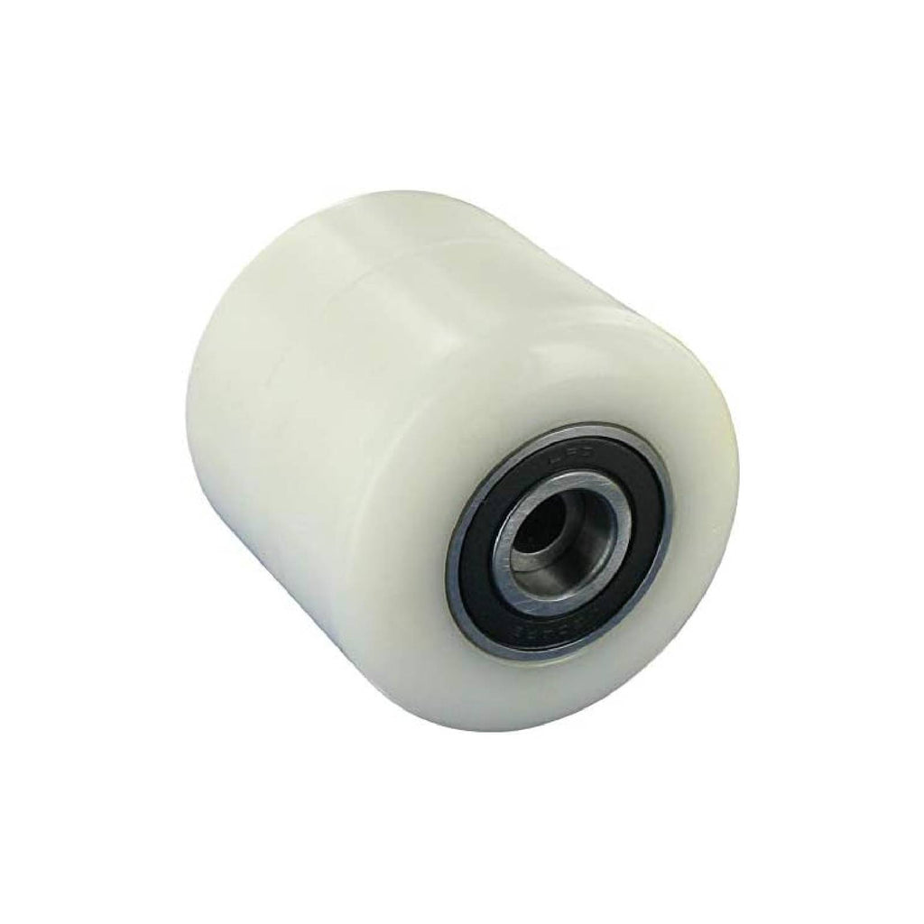 • Materiale di rivestimento: Il rullo è rivestito in nylon, un materiale noto per la sua durata, resistenza all'usura e capacità di scorrimento agevole, il che permette al transpallet di spostarsi senza attriti eccessivi.
