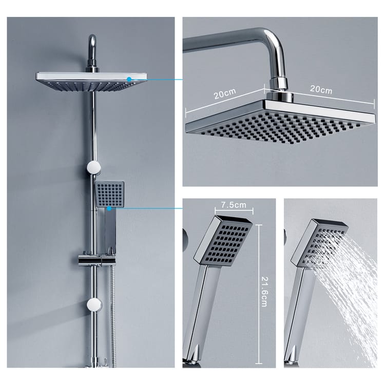 Ampio soffione quadrato 20x20 cm: effetto pioggia per un getto d’acqua omogeneo e rilassante