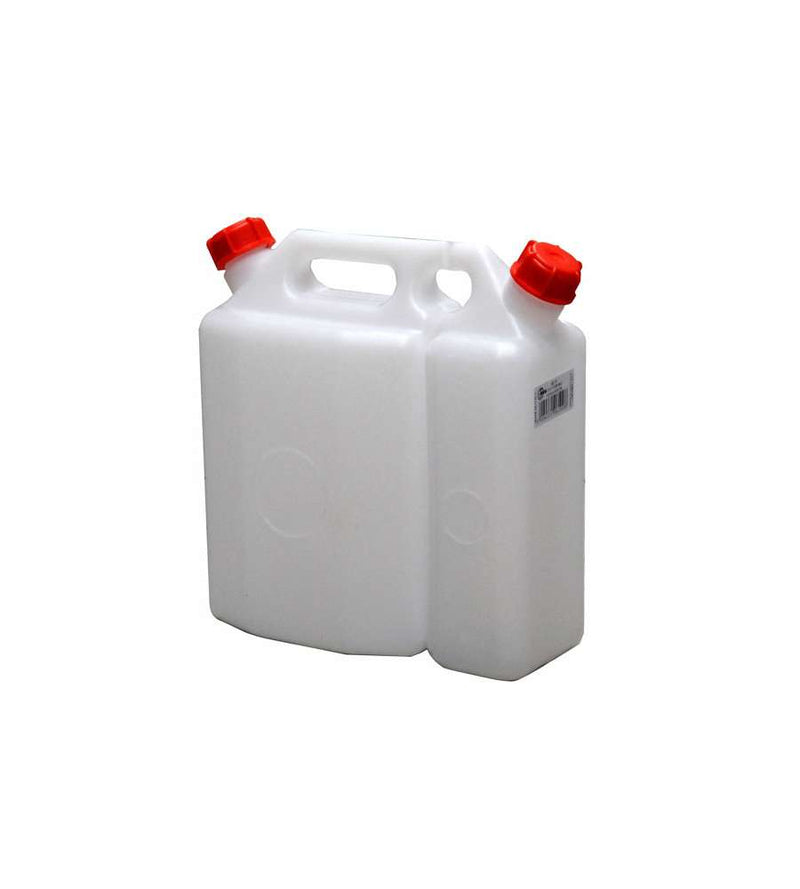Tanica alimentare in PVC a doppio uso, progettata per contenere sia olio che benzina in compartimenti separati.