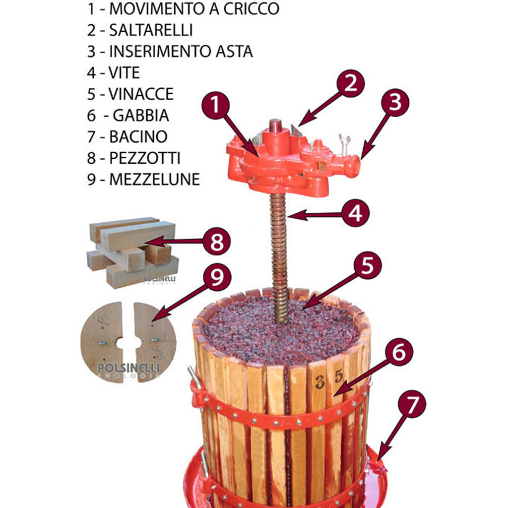 La vite in acciaio trafilato di cui è munito il torchio idraulico garantisce una solidità ottimale durante tutte le fasi della lavorazione. Il torchio idraulico da 60 cm è provvisto inoltre di una gabbia in doghe di faggio evaporato con perni sfilabili, capace di offrire massima praticità d'uso.