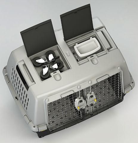 Tra le dotazioni sono presenti una maniglia di trasporto, due porte realizzate in metallo, ad apertura e chiusura separata, ed infine una ciotola.